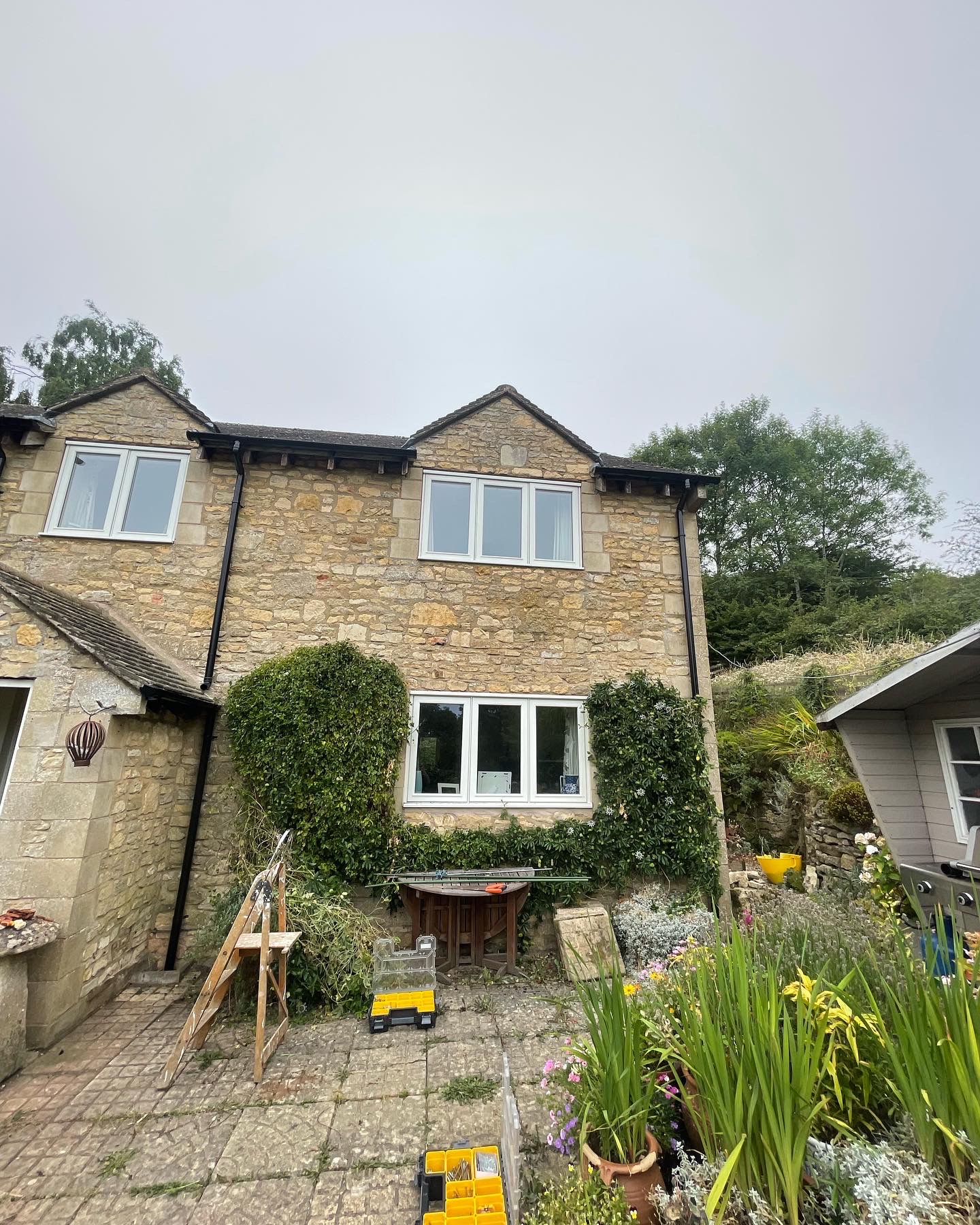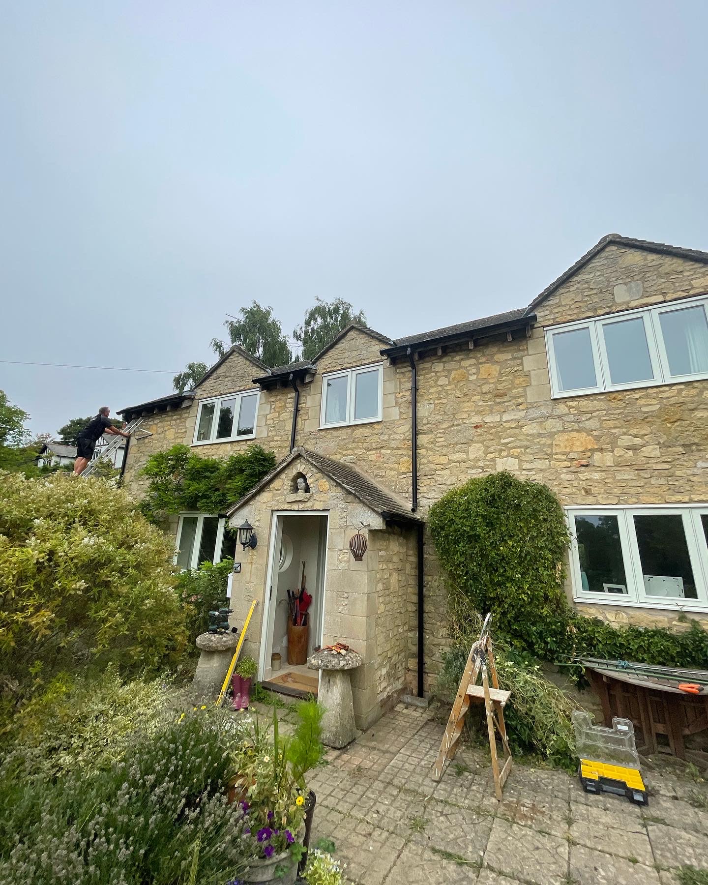 Leaking and brittle 25 year old guttering replaced on a property on the side of Cleeve Hill, Cheltenham. Being located on the side of a hill the elements are much more severe. This customers gutter had served them since initially buying the property 25 years ago. We upgraded the guttering from a dated brown square colour to a much more modern black half round.